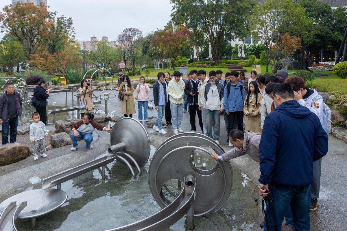 在徐劲的讲解下,同学们亲身体验了公园内的互动设施,参观了“七株银杏”地标、渔之颂雕塑、汉白玉浮雕长廊、儿童友好互动区等。