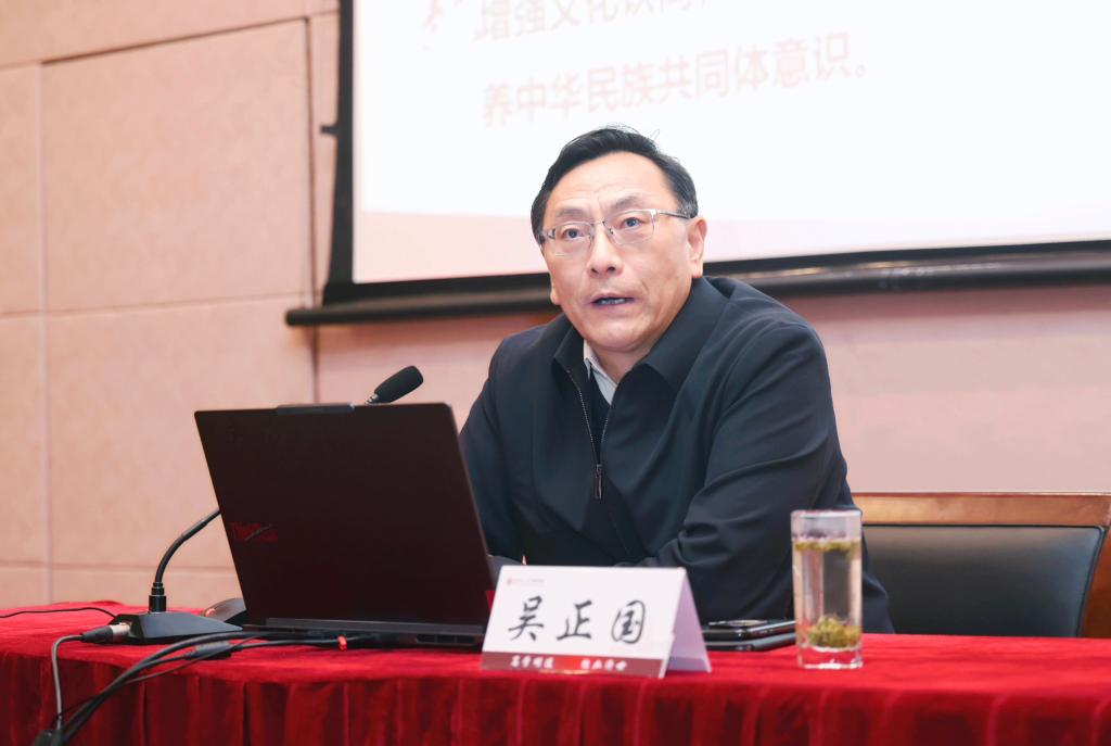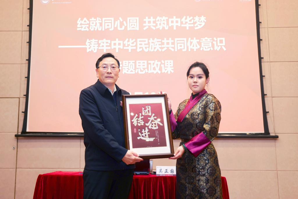 吴正国从理论、历史、实践三个维度切入,深刻阐释了铸牢中华民族共同体意识的理论逻辑、历史经纬与实践路径,并结合亲身援藏经历,以鲜活案例解读新时代党的边疆整体治理之路。同时他介绍了学校开展民族工作的生动实践,强调要坚持将民族团结进步与国家战略重点相结合,实现民族地区支援帮扶有力度;坚持将民族文化交流与民族共生共融重点相结合,实现民族文化平台建设有显度;坚持将民族学生培育与立德树人重点相结合,实现民族学生人才培养有效度。他勉励青年学生要与祖国共命运、与民族同呼吸、与人民心连心,像石榴籽一样紧紧抱在一起,共同为强国建设、民族复兴贡献青春力量。